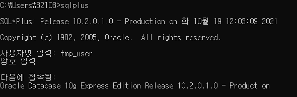 관리자로 접속했을때와 같이 sqlplus를 입력해준다음 새로 만든 계정으로 로그인하면 됩니다.