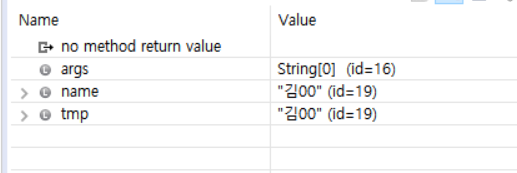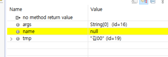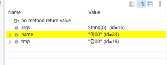 위의 사진은 String tmp = name까지 디버깅했을때 모습입니다. 힙 영역에 19번이라는 참조값을 가지는 김00 문자열이 만들어지고 name과 tmp가 이 참조값을 가지는 모습을 볼 수 있습니다.