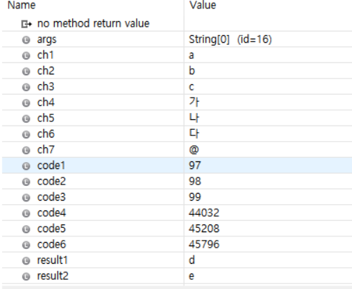char은 위와 같이 참조값이 아닌 그냥 값이 변수에 대입되는 것을 볼 수 있습니다.