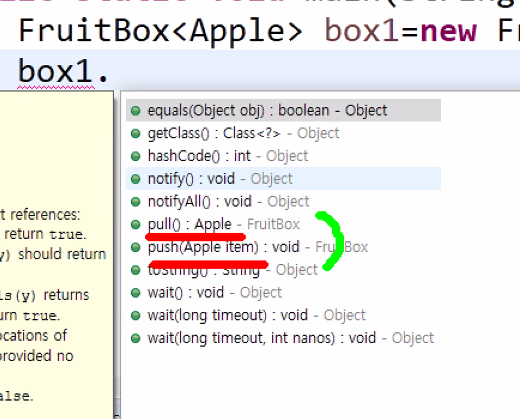 클래스 타입이 FruitBox<T> 이므로 T에 원하는 과일을 넣어 원하는 클래스 타입을 만들어줍니다.