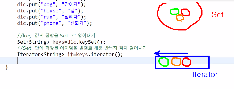 먼저 key 값의 집합을 set으로 만듭니다. 그 다음 set안에 저장된 아이템을 일렬로 세운 반복자 객체를 얻어냅니다.