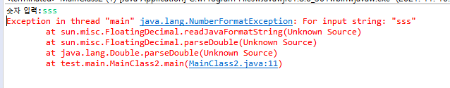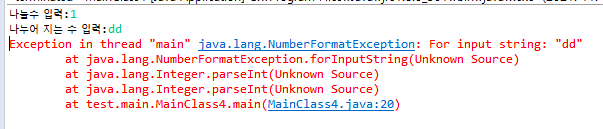 또한 숫자가 아닌 수를 입력할 경우에도 java.lang.NumberFormatException 오류가 발생합니다.