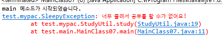 또한, 너무 졸려서 공부를 할 수가 없다는 SleepyException 오류가 발생하는 모습도 볼 수 있습니다.