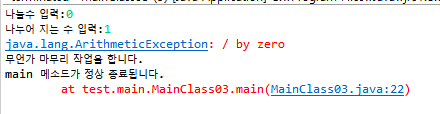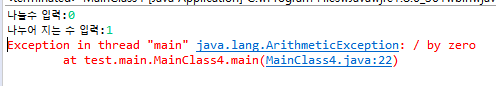 하지만 이렇게 0으로 나눌경우에는 java.lang.ArithmeticException 오류가 발생합니다.