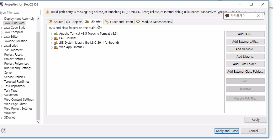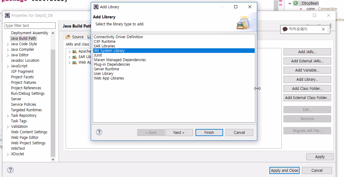 JRE System Library -> Next -> default JRE 선택후 finish -> Apply and Close