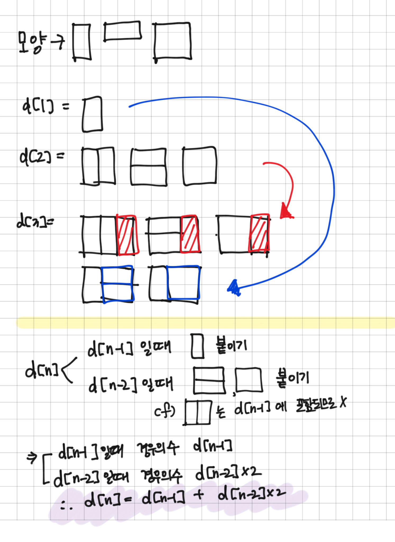 - 이때 2*1 타일 두개는 d[n-1]에 포함되므로 패스한다.