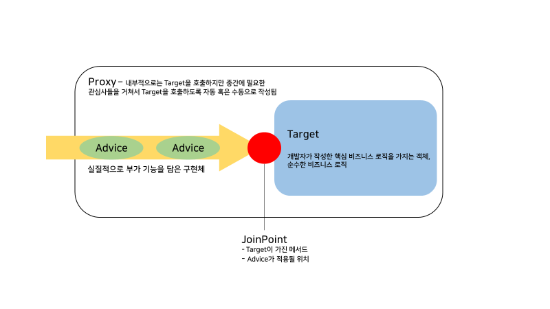 - 내부적으로 Target을 호출하지만, 중간에 필요한 관심사들을 거쳐서 Target을 호출하도록 자동 혹은 수동으로 작성된다.