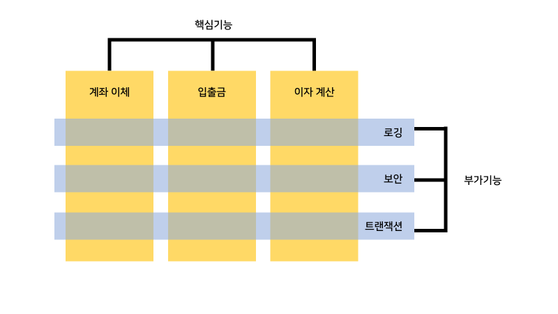위 그림에서 계좌이체, 입출금, 이자계산 모듈이 핵심기능에 해당되며, 로깅, 보안, 트랜잭션이 부가기능에 해당된다.