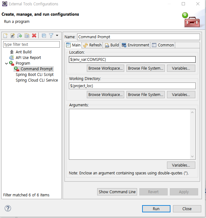 2. ${env_var:COMSPEC}, ${project_loc} 입력