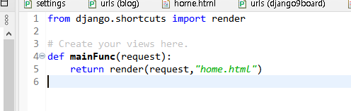views 폴더에서 mainFunc를 작성해주자. mainFunc이 실행되면 home.html에 render한다는 뜻이다.