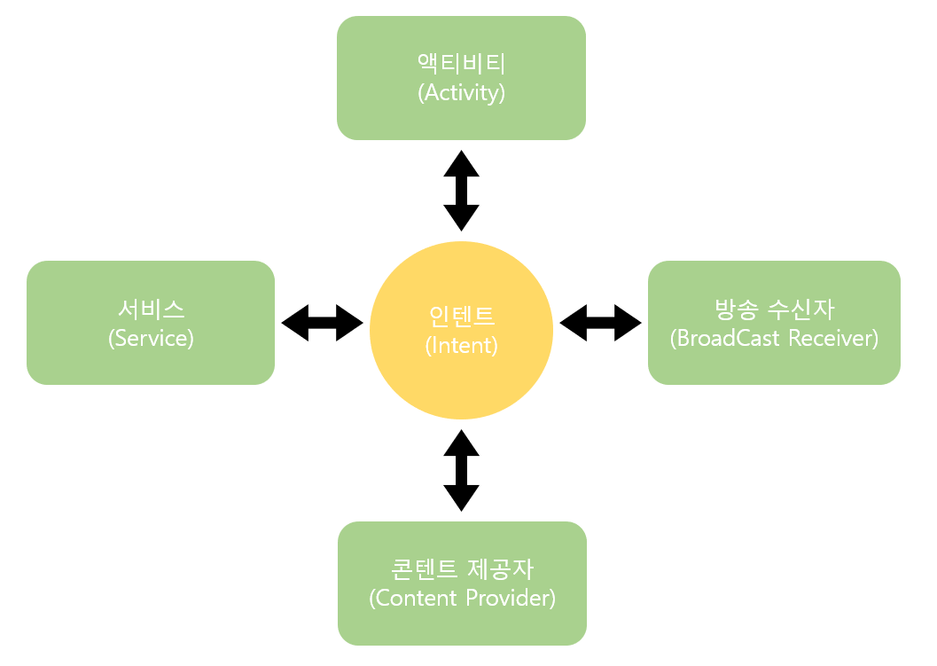 - 각 컴포넌트들은 인텐트를 통해 서로 상호작용한다.
