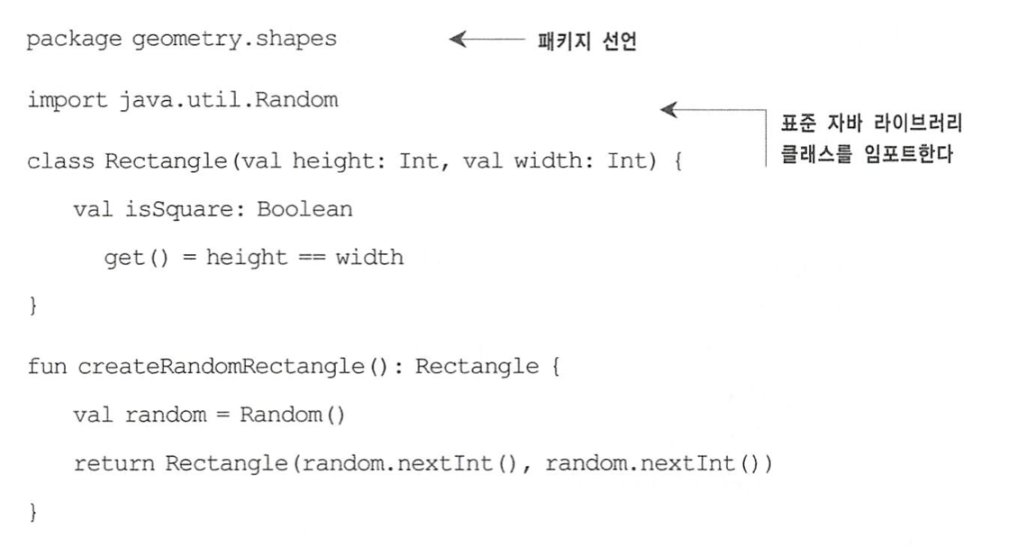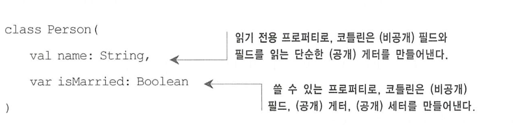 클래스라는 개념의 목적은 데이터를 캡슐화하고 캡슐화한 데이터를 다루는 코드를 한 주체 아래 가두는 것이다. 자바에서는 데이터를 필드에 저장하며, 멤버 필드의 가시성은 보통 비공개다. 클래스는 자신을 사용하는 클라이언트가 그 데이터에 접근하는 통로로 쓸 수 있는 접근자 메서드(세터, 게터)를 제공한다. 자바에서는 필드와 접근자를 한데 묶어 프로퍼티라고 부르며, 프로퍼티라는 개념을 활용하는 프레임워크가 많다. 코틀린은 프로퍼티를 언어 기본 기능으로 제공하며, 코틀린 프로퍼티는 자바의 필드와 접근자 메서드를 완전히 대신한다. val로 선언한 프로퍼티는 읽기 전용이며, var로 선언한 프로퍼티는 변경 가능하다.