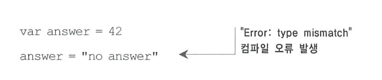 var 키워드를 사용하면 변수의 값을 변경할 수 있지만 변수의 타입은 고정돼 바뀌지 않는다. 예를 들어 다음 코드는 컴파일할 수 없다.