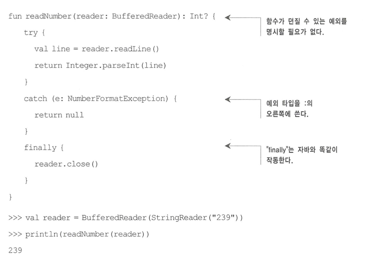 - 코틀린 예외 처리는 자바와 비슷하다. 다만 코틀린에서는 함수가 던질 수 있는 예외를 선언하지 않아도 된다.