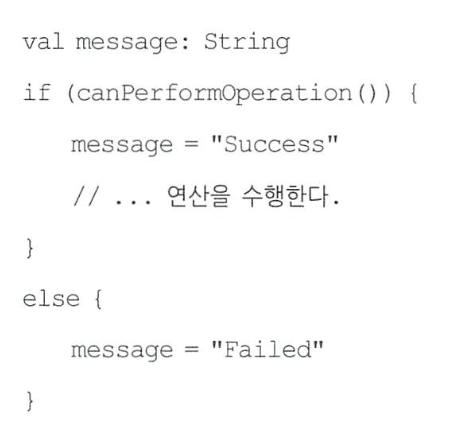 val 변수는 블록을 실행할 때 정확히 한 번만 초기화돼야 한다. 하지만 어떤 블록이 실행될 때 오직 한 초기화 문장만 실행됨을 컴파일러가 확인할 수 있다면 조건에 따라 val 값을 다른 여러 값으로 초기화할 수도 있다.