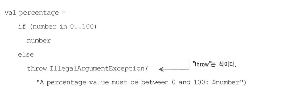 다른 클래스와 마찬가지로 예외 인스턴스를 만들 때도 new를 붙일 필요가 없다. 자바와 달리 코틀린의 throw는 식이므로 다른 식에 포함될 수 있다.