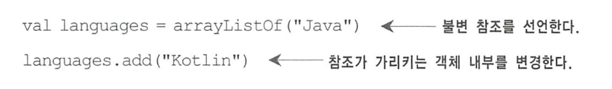 val 참조 자체는 불변일지라도 그 참조가 가리키는 객체의 내부 값은 변경될 수 있다.