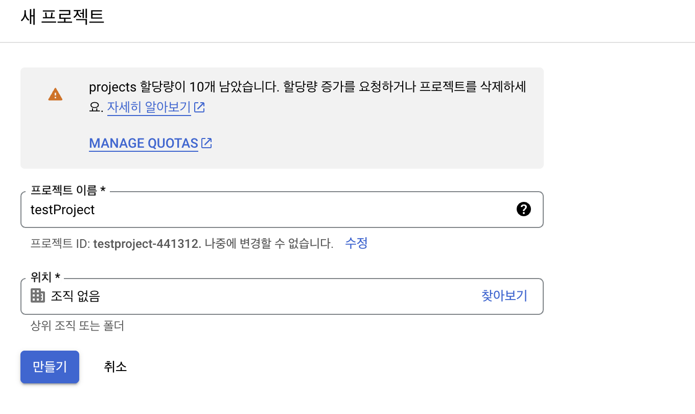 등록할 프로젝트 이름을 입력해주고 만들기를 클릭합니다.