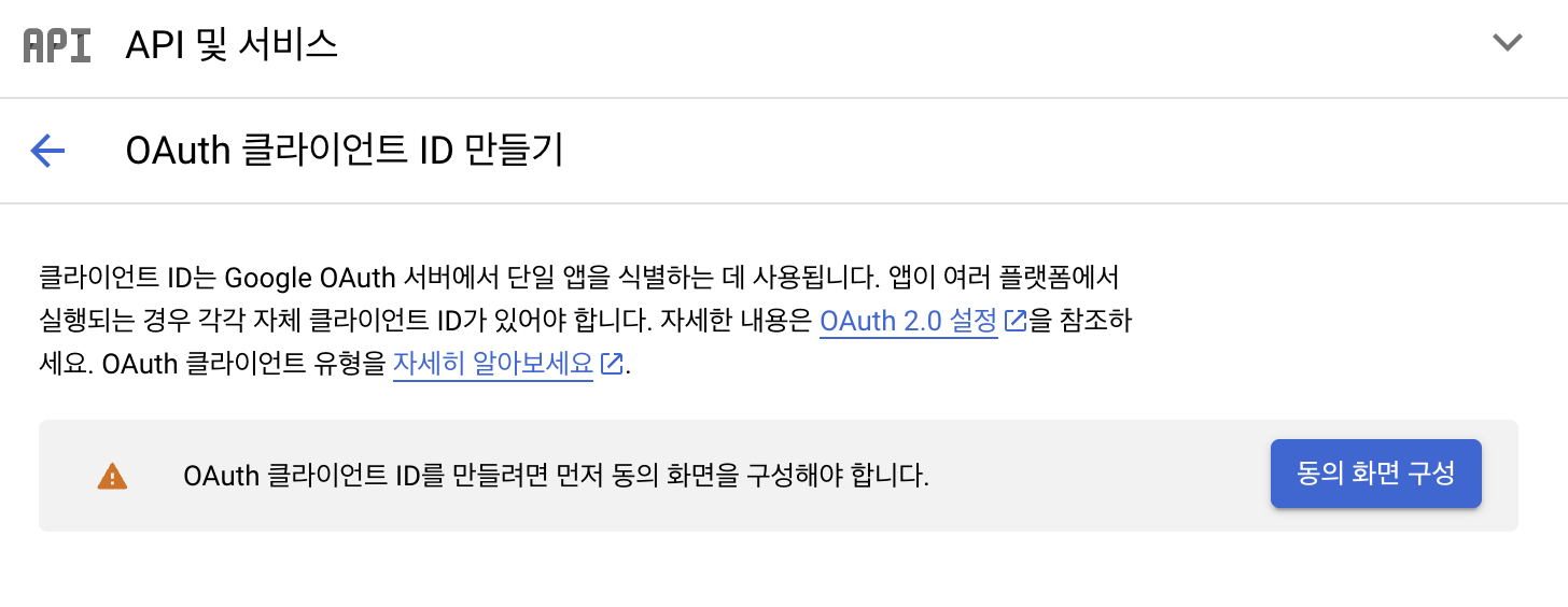 사용자 인증 정보 -> 사용자 인증 정보 만들기 -> OAuth 클라이언트 ID 만들기에 들어가줍니다.