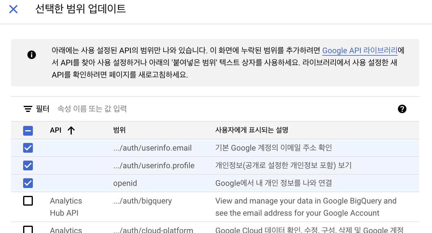 범위 추가 또는 삭제 버튼을 누른 후 email, profile, openid를 추가해주고 저장해줍니다.