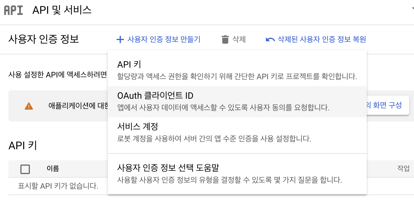 사용자 인증 정보 만들기 클릭 -> OAuth 클라이언트 ID 에 들어가줍니다.