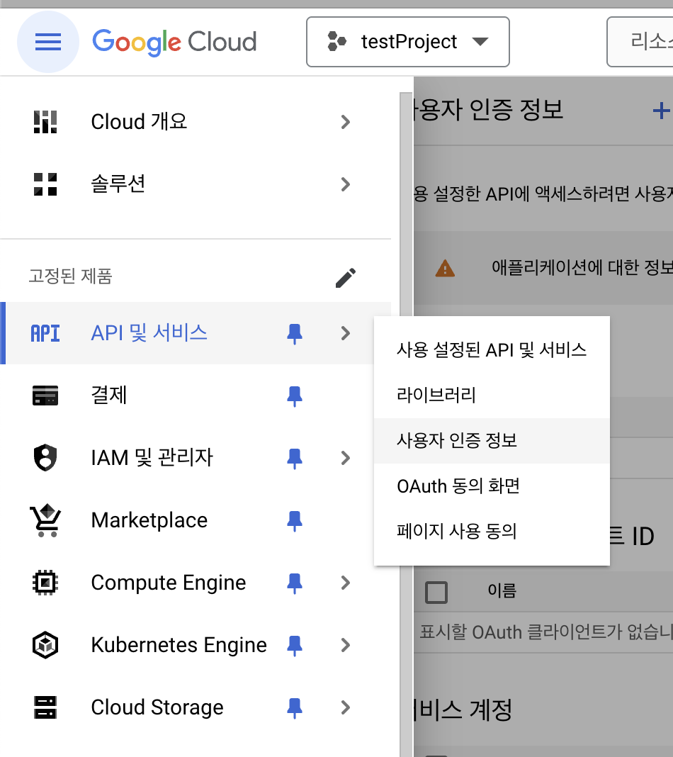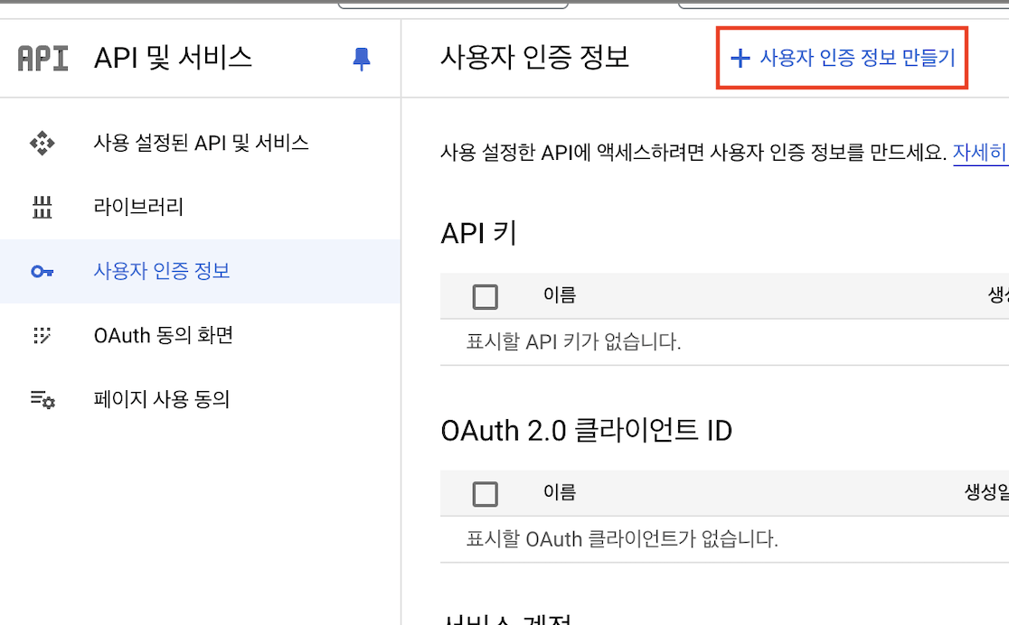 해당 프로젝트로 들어와준 후 왼쪽의 햄버거 탭 클릭 -> API 및 서비스 -> 사용자 인증 정보에 들어가줍니다.