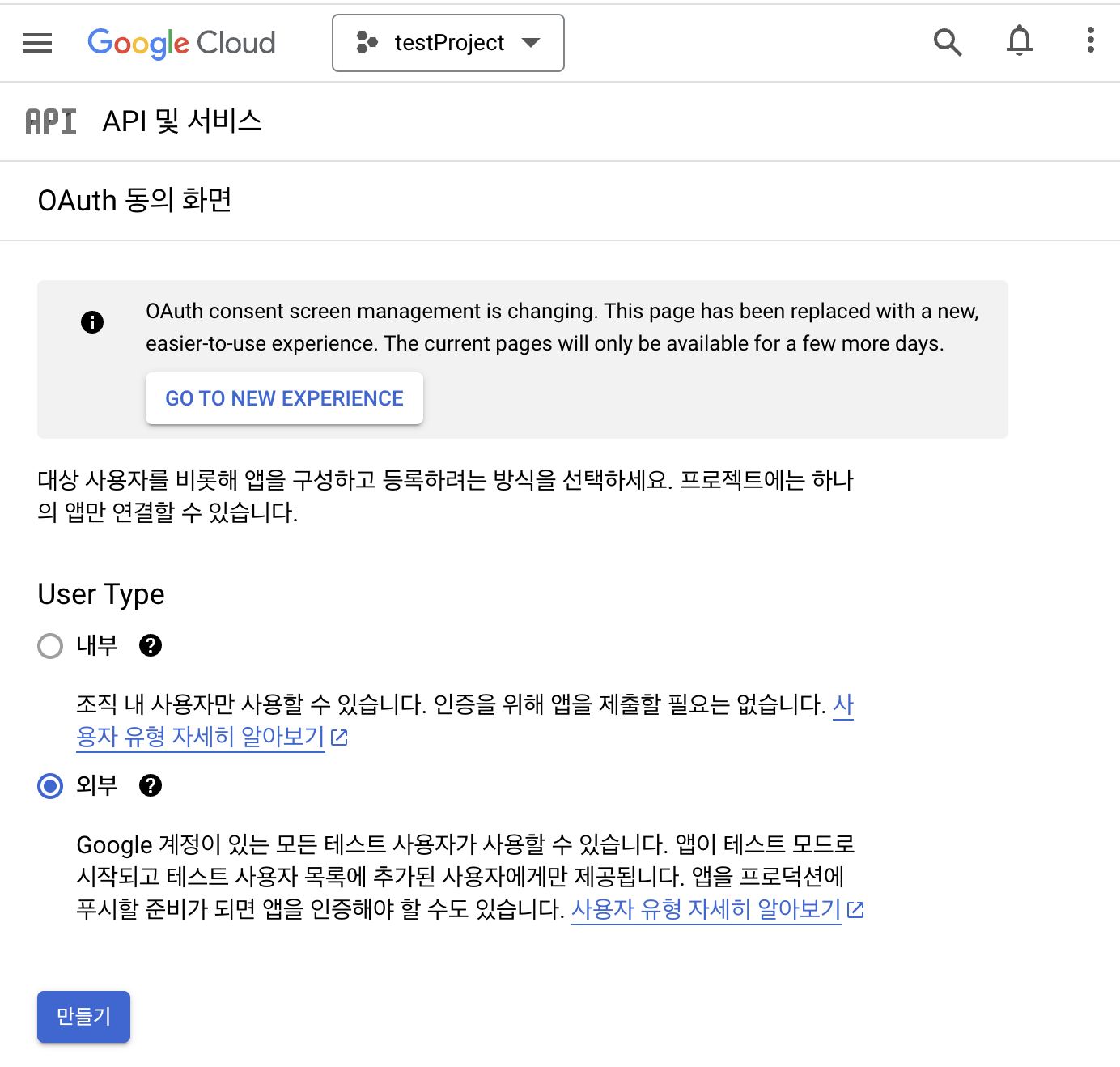 User Type을 외부로 설정해주고 만들기를 클릭해줍니다.