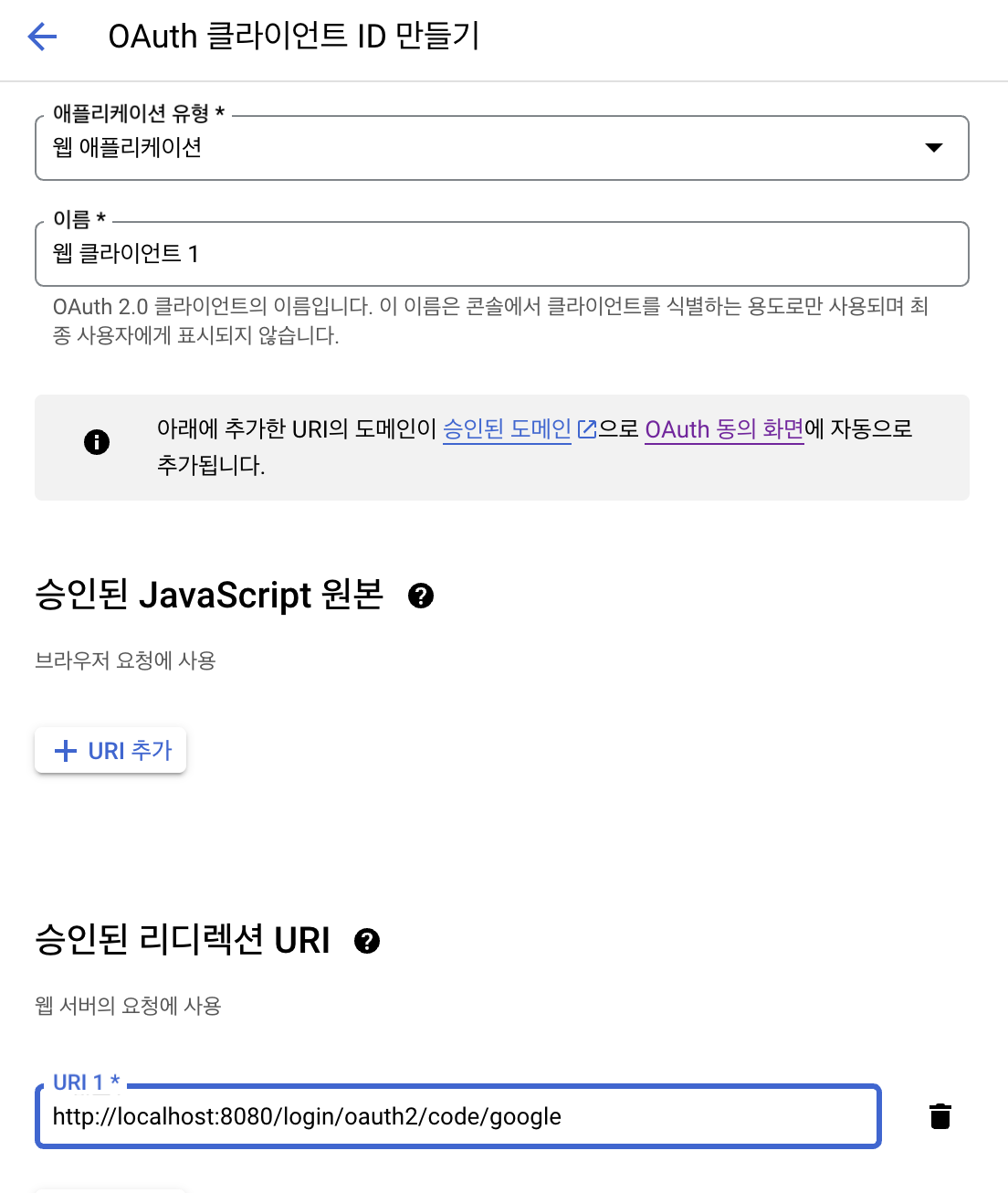 지금은 로컬 개발 환경에서 작업 중이므로 http://localhost:8080/login/oauth2/code/google과 같이 설정하면 됩니다.
