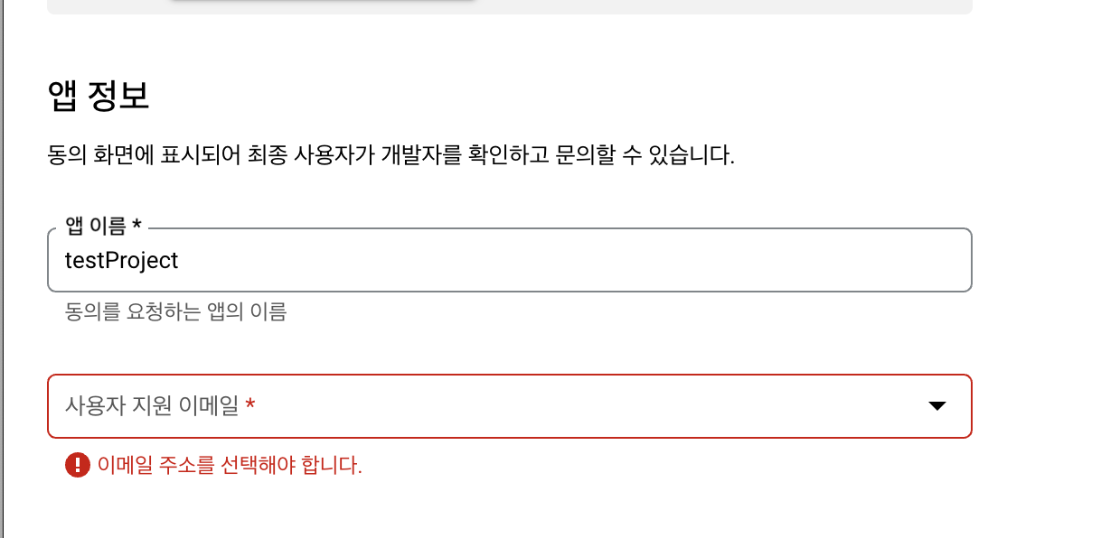 앱 정보에 앱 이름과 사용자 지원 이메일을 입력해줍니다. 하단에 있는 개발자 연락처 정보도 입력해줍니다.